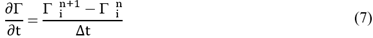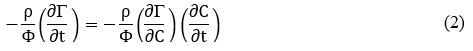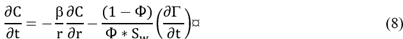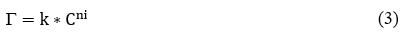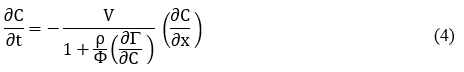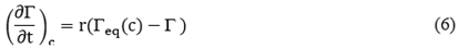Como se mencionó anteriormente, Γ representa el nivel de adsorción, C la concentración de la solución, y la forma de la isoterma es gobernada por los parámetros k y ni determinados de manera experimental. El término ∂Γ/∂C de la ec. (2) es el gradiente de la isoterma de adsorción a la concentración C. Teniendo en cuenta las suposiciones anteriores, el modelo matemático para representar el fenómeno de adsorción se muestra en la ec. (4).