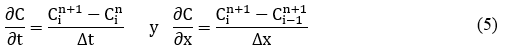 La ec. anterior no tiene solución analítica simple, por lo tanto, se debe solucionar mediante aproximaciones numéricas, en este caso diferencias finitas (ec. (5)) donde los superíndices hacen referencia al tiempo y los subíndices hacen referencia al espacio. A continuación, se muestran las aproximaciones de la primera derivada con respecto al tiempo y la distancia.