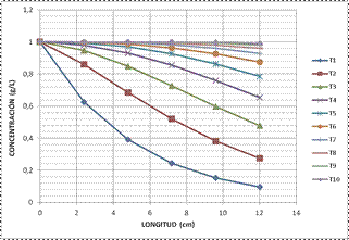 Existen tres formas de solucionar estas aproximaciones: implícita, explícita y una combinación entre estas (Crank-Nicolson). Para el caso de estudio se utilizó la forma implícita, se construyeron las respectivas matrices para un modelo 1D y mediante Excel se generó la inversa y su respectiva solución para distintos tiempos iniciando en cero (0) y finalizando hasta el tiempo necesario para que la concentración se acerque a cero (0), los resultados se evidencian en la Fig. 2