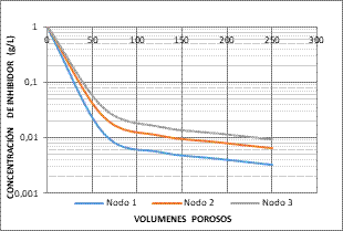 En la Fig. 4 se representa gráficamente el fenómeno de desorción, mediante la variación de la concentración del inhibidor en función de los volúmenes porosos de agua producida. Cabe resaltar que el nodo 3 corresponde a la salida del plug y por lo tanto representa la concentración en la cara del pozo. Se puede observar que luego de producir 250 volúmenes porosos, la concentración del inhibidor a la salida del plug es aprox. 0,01 g/L (10 ppm). Esta concentración es importante ya que, según el tipo de inhibidor se determina si aún evita la formación de escamas, o si se debe realizar una nueva inyección del tratamiento.