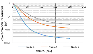 Figura 3: Concentración del inhibidor en del tiempo para diferentes nodos