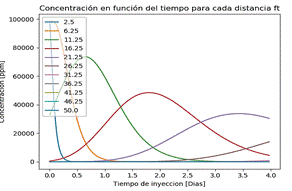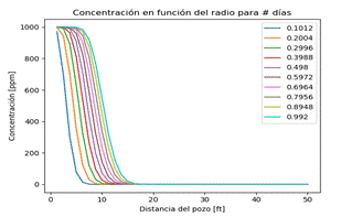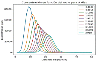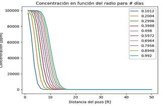 Así mismo, en la Fig. 12 se puede monitorear la concentración del inhibidor alrededor del pozo (radial), evidenciando que, para cualquier tiempo, la concentración de inhibidor aumenta a medida que la distancia al pozo se hace mayor, hasta un valor máximo y posteriormente disminuye hasta llegar a cero.