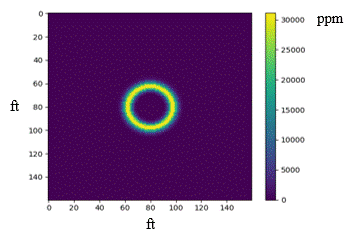 Luego del pre-flujo, se procede a inyectar el tratamiento, en la Figura se observa la variación de concentración de inhibidor en el pozo al inicio de la inyección del tratamiento. Posteriormente la concentración de inhibidor en todo el pozo es de 100000 ppm, lo cual está representado por el círculo de color amarillo. Así mismo, mediante la Figs. 7 y 9 se puede monitorear la concentración de inhibidor alrededor del pozo, para diferentes días.