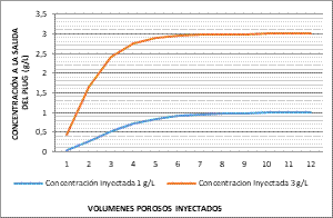 Para este análisis consideramos un plug de porosidad 20%, longitud 12 cm y radio 1.5 cm. La variable a analizar son los volúmenes porosos inyectados a un caudal de 1.5 cm3/min, para diferentes concentraciones iniciales de inhibidor. En la Fig. 16, se representa la concentración del inhibidor a la salida del plug en función de los volúmenes porosos inyectados, para dos concentraciones de inhibidor 1 g/L y 3 g/L. De acuerdo con el diagrama, hay un número de volúmenes porosos en los cuales se alcanza la concentración máxima en la fase móvil (se satura la muestra); lo cual, permite establecer un máximo de volúmenes porosos a inyectar durante un tratamiento de inhibición a escala de laboratorio, que es fundamental para definir de manera óptima el volumen de inhibidor a emplear a condiciones reales de campo, evitando sobrecostos y logrando tratar toda la región de interés.