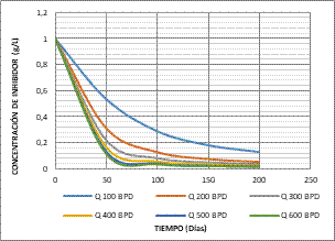En la Fig. 17, se observa que para un caudal de 100 BPD el tratamiento tiene una mayor duración, comparado con el caudal de 200 BPD, y este dura más comparado con el de 300 BPD; sin embargo, para caudales superiores a 400 BPD se obtienen tiempos de vida similares del tratamiento químico, lo que significa que a estos caudales baja al mínimo la concentración del inhibidor.