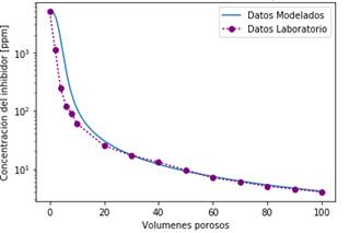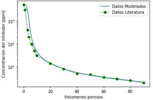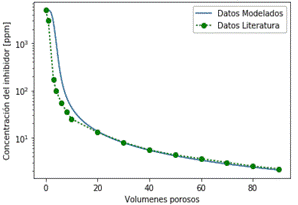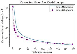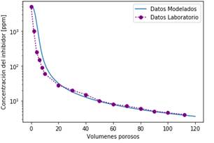 Figura 4: Modelamiento de la desorción de inhibidor durante una prueba coreflood (Residuales de Inhibidor para flujo lineal).