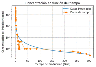 Utilizando las ecuaciones (6) y (8), y las aproximaciones (5) y (7) se soluciona el modelo mediante métodos numéricos multivariables obteniendo resultados de desorción. En la Fig. 6 se observa el fenómeno de desorción en campo, mostrando la concentración remanente del inhibidor en el agua producida durante determinado tiempo. Esta concentración es de gran importancia pues determina si el tratamiento aun es efectivo, para este caso con una concentración inicial de 1 g/L y un caudal de 400 Barriles Por Día (BPD) después de 200 días, existía una concentración de 24.8 ppm (0.0248 g/L).