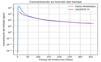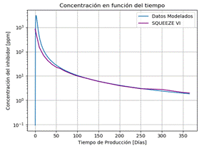 En las Figs. 25, a 30, se presenta la comparación de los simuladores, lo cual sumado a las validaciones con datos de laboratorio y campo se puede concluir que la herramienta computacional diseñada es precisa y puede ser usada en predicciones para otros campos. Así mismo, es posible evidenciar que el corte de agua influye en gran medida, un ejemplo de ello se detalla en la Fig. 30 con un corte de agua de 90%, el inhibidor está por debajo de 1 ppm en 350 días, mientras que en la Fig. 25 para los mismos 350 días, la concentración aun es cercana a 50 ppm