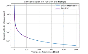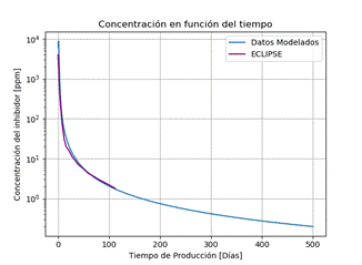 Estas simulaciones son muy importantes, ya que el monitoreo de la concentración a través del tiempo permite evitar la depositación de escamas en la formación y cara del pozo. Es de resaltar que en la Fig. 15 se hace la comparación con un modelo conceptual realizado en ECLIPSE con el fin de soporta el modelo numérico y darle mayor veracidad, antes de pasar a la etapa de optimización y comparación con campo.