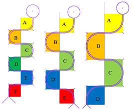 Fig. 7 shows the division into blocks of the microdevice of r4, r6 and r8, with a total of 6 blocks, 5 blocks and 4 blocks respectively, due to the curves present in the channels, which are identified by colors.