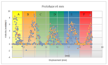 In the case of the histogram of the curved microdevice with a radius of 4 mm, it is observed that the highest number of velocities is concentrated in the range of 0.0 - 1.3 mm/s, with a mesokurtic curve indicating a wide range of velocities and a slight positive asymmetry. The velocity distribution shows that it stops at the crests (Fig. 8). In the histograms of the curved microdevices with radii of 6 mm and 8 mm, it can be seen that the highest number of velocities are concentrated in the middle sections respectively. The leptokurtic curve indicates that the velocity values are concentrated around their mean, with a positive skewness where the smaller velocity data are concentrated towards the right of the distribution (Fig. 8). For velocity analysis, separation into sections was performed considering changes in channel geometry and total microchannel length."
