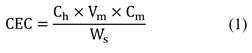 The cation exchange capacity was calculated using eq. (1), where CEC is the cation exchange capacity, Ch is a volumetric constant equivalent to 100, Vm is the volume of methylene blue solution in mL, Cm is the concentration of methylene blue (0,01 meq/mL), and Ws is the weight of the rock sample used.