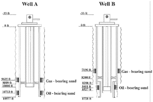In this study, the mechanisms of formation damage in two wells, named A and B, were investigated in a brown oil and gas producing field. The mechanical states of the wells, along with pressure logs and analyses, indicate the presence of gas in the upper production intervals and oil in the lower intervals, showing a pronounced depletion over time since the start of their production life. Fig. 2 provides a schematic representation of the mechanical states, highlighting the depths of the perforated intervals. The wells are characterized by gas production from the upper intervals through the annulus and oil production from the lower intervals through tubing with mechanical pumping, in a dual production scheme. The main difference between the evaluated wells lies in the depth of their completed production zones.