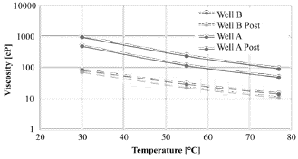 Figure 7: Viscosity curves of the crude oils from wells A and B before and after the fluid-fluid compatibility test.