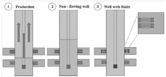 After the well is shut in, a rise in liquid level (either crude oil and/or formation water) to the gas perforations is seen, leading to the coexistence of gas, oil, and formation water.