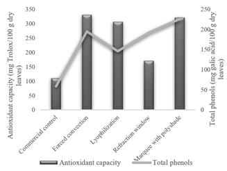 The different drying techniques to which fresh basil was subjected showed that phenols and antioxidants were significantly preserved at the end of drying, with a high correlation with these compounds. Temperature has a direct impact on these secondary metabolites. Phenols and antioxidants are characterized by being thermosensitive [17], which is related to the conservation of their contents in drying by forced convection and marquee with polyshade.