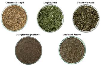 The temperatures reached in these two methods did not exceed 55ºC, unlike drying in a refractive window and lyophilization. A study carried out by Sharma et al. (2018) [18], reported that the contents of phenols and antioxidants decreased in relation to the drying method, with microwaves maintaining the highest concentration of the compounds.