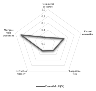 The marquee with polyshade technique reported the highest percentage of essential oil, proving to be a less aggressive technique, which, thanks to the adaptation, maintains the drying system at temperatures below 45 °C, suggested as the ideal dehydration temperature without generating loss of volatile compounds [13,14].