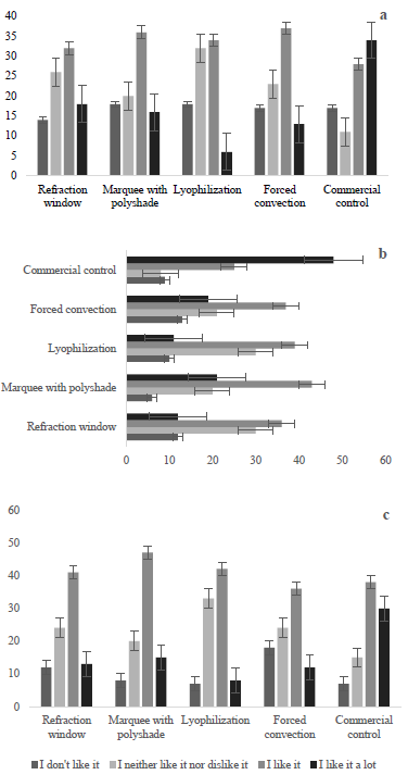 Fig. 4 shows the sensory evaluation results that 90 untrained evaluators carried out on the preference and taste for the aromatic infusions prepared with the dehydrated material obtained through the different drying methods evaluated. Infusions are usually accepted for taste (a), smell (aroma) (b), and color (c), where there is no significant difference between treatments. However, it is worth highlighting the higher degree of acceptance by the commercial sample in each of the parameters, most likely due to the treatment and mixture with other aromatic species that increase the sweetness in the infused drink.