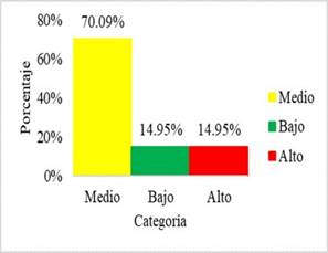 Para determinar el nivel del comportamiento inseguro se toma en cuenta la suma obtenida en las dimensiones por cada encuestado agrupando en 3 categorías, tal como se muestra en la Fig. 1. Nivel del estado inseguro de los trabajadores.