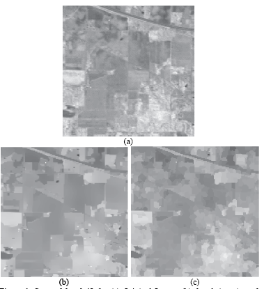 For India Pines, 20 smoothing iterations were performed using nonlinear diffusion in order to obtain a multiscale representation. The diffusion coefficient α was set equal to 0.01, and the scale step µ was set equal to 5. For the binary partition tree, an initial partition was performed with a region growing algorithm. Each level of the binary partition tree is taken as a scale. Fig. 1 (b,c) shows the 42nd band for the smoothed image with nonlinear diffusion in the third iteration and the image in the 120th level in BPT.