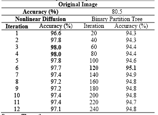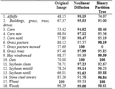 Table 2 shows the classification accuracy per class obtained from the fourth iteration of nonlinear diffusion and the 120th level of binary partition tree.