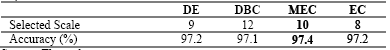 The scale selection criteria were compared according the classification accuracy obtained from the smoothed image selected as the optimal scale. Table 3 shows the selected scale for the decorrelation criterion (DE), the minimal entropy change (MEC), the diffusion balance criterion (DBC), and the entropy change (EC).