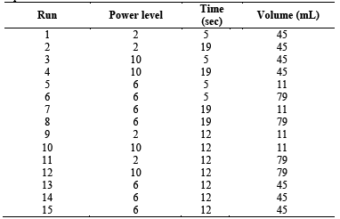 Three levels were assessed for each factor: power levels from 2 to 10 (dimensionless), processing times from 5 to 20 seconds and sample volumes from 10% to 65% of the total container volume (100 mL Schott beaker with external diameter of 50 mm and 70 mm height). The concentration of the sample expressed as degrees brix (45°Brix) and the position of the container within the cavity (center) were held constant. Using SAS software, a statistical design of the response surface (central composite) with three replicates at the center point was prepared, as shown in Table 1.