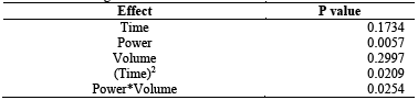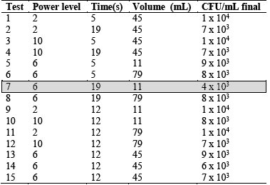 Table 2 presents the microbial destruction results using the conditions defined in the experimental design and an initial concentration of bacterial inoculum of 2x105 CFU/mL for all the samples analyzed. The minimum value was obtained when the process conditions were: power level of 6, time of 19 seconds and 11 mL volume. In terms of biological destruction, low volumes and high processing times are the most suitable. Analysis of variance demonstrated the significant effect of the operating conditions (P <0.05) on the lethality. Table 3 lists the statistical results of experimental design.