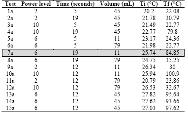 To analyze the thermal kinetics of the process, the values of the initial (Ti) and final temperatures (Tf) obtained for each sample are reported (Table 5). The conditions for which the minimum count of CFU/mL was obtained were a volume of 11 mL, a power level of 6 and a time of 19 seconds, for which the final temperature was 84.85°C, where this value is greater than the inactivation temperature (80°C) for bacterial vegetative cells [18].