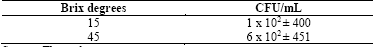 The samples that were subjected to the microwave processing were obtained from preparing a culture of Bacillus licheniformis for 24 hours, then centrifuging at 4000 rpm for 20 minutes to form a pellet that was then resuspended with coffee extract at 45 °Brix. The initial concentration of bacteria was on average 2 x 105 CFU/mL.
