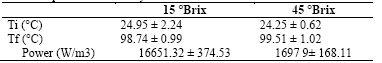 This result occurs because the composition and thermal properties (specific heat) do not vary noticeably with ºBrix (less than 8%). According to Datta and Rakesh [23], these properties are critical in heating via microwave and could generate a substantial change in the process.
