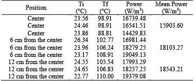 Table 9: Values of power absorbed by the coffee extract located at various positions in the microwave.