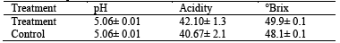 Table 10 lists the physicochemical properties of the liquid coffee extract. No statistically significant differences (P>0.05) were observed between the control and treatment in terms of the values of pH, acidity and ºBrix.