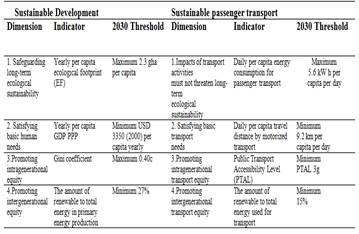 Table 1: Main dimensions indicators and suggested 2030 threshold values for sustainable development and sustainable passenger transport