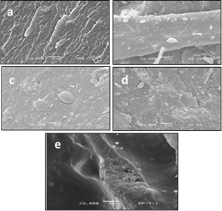 Figure 3: SEM Micrographs of RPET/Cloisite 10A mixtures with 0 (a), 1(b), 3(c), 5(d) and 7(e)% by weight of clay at 3000 X.