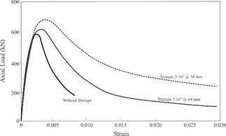 Figure 1: Load-strain relationships for concrete square prisms with different transverse reinforcement.