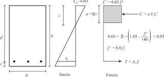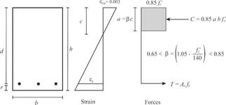 Analogously, Fig. 3 shows some basic hypotheses used by the ACI 318-11 code for rectangular sections, and considering force equilibrium conditions, the nominal moment strength can be estimated from Eq. (2).