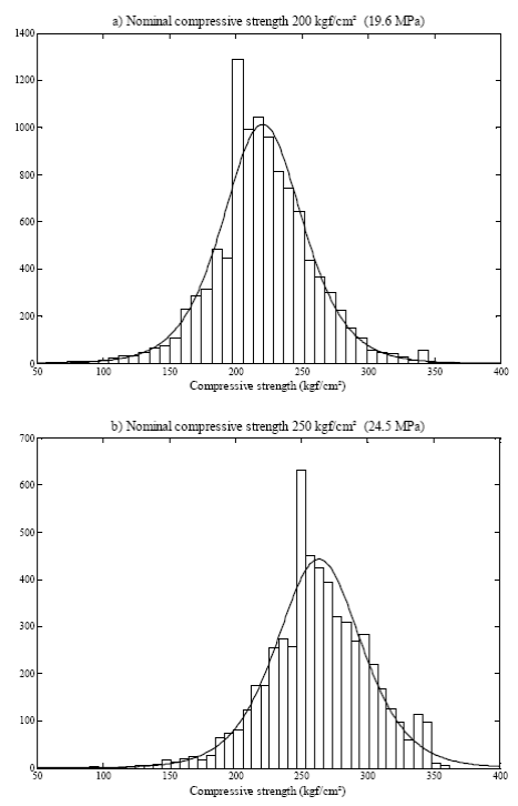 More than 16,000 concrete compressive strength tests are carried out by Contratos y Servicios Maquipa SA de CV, located at the city of Aguascalientes, Ags., Mexico, for concrete specimens sampled from mixed concrete provided by local suppliers. All tests correspond to specimens of concrete designed for a nominal compression strength of 200 kgf/cm² (19.6 MPa) and 250 kgf/cm² (24.5 MPa) at 28 days age. Fig. 4 shows the histograms corresponding to each concrete compressive strength.