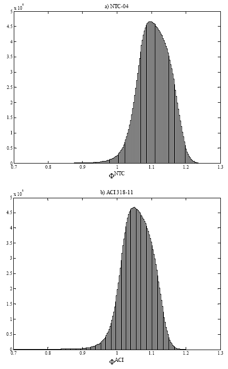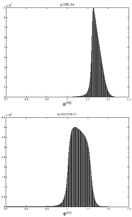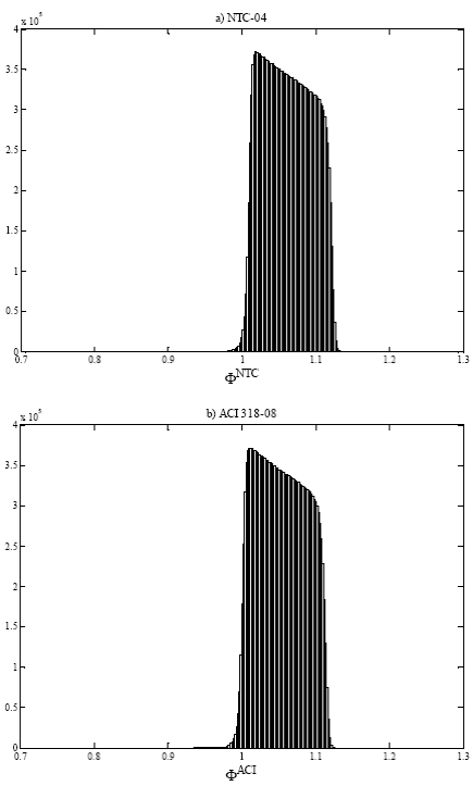 Designing all structural elements with the same steel ratio hardly can occur in professional practice, so it is more reasonable to consider a wide range of possibilities within the limits stipulated in the constructions codes. Therefore, in Fig. 7 histograms of Φ considering the steel ratio as an IID random variable with Uniform distribution according to eq. (11) and ƒ c ’ = 250 kgf/cm² (19.6 MPa) are shown. The results for ƒ c ’ = 200 kgf/cm² (24.5 MPa) have a similar distribution that are shown in Fig. 7b. The central tendencies and dispersion values for these results are shown in Table 4.