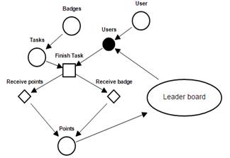 System has two main rules: the Points rule (R recieve badge ) describes normal behavior how user receives the points for a completed task, and the Badge rule (R recieve badg ) describes how user gets points for finished tasks which have badges associated with them.