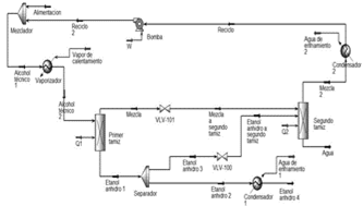El esquema de simulación que se muestra en la Fig. 1 es el correspondiente a la técnica de adsorción con tamices moleculares. El proceso de separación opera en fase vapor y está conformado por dos lechos de tamiz molecular. En un primer lecho se lleva a cabo la deshidratación, mientras que de manera paralela, en un segundo tamiz se lleva a cabo la operación de regeneración. Esta se logra recirculando parte de los vapores de etanol anhidro con el fin de retirar la humedad acumulada. Además, integran el sistema un vaporizador, que hace pasar vapores de etanol azeotrópico a alta presión, dos condensadores, un separador y una bomba.