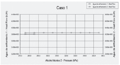 En la Fig. 4 se muestra la tabla correspondiente al caso 1, donde se evidencia que el calor cedido en el condensador que condensa la mezcla 2 (condensador 2) permanece constante al aumentar la presión del alcohol técnico alimentado al primer tamiz (alcohol técnico 2); es decir, al aumentar la presión del alcohol técnico 2 en un 30% continua invariable el agua de enfriamiento en el condensador 2. De igual manera se aprecia que el calor cedido en el condensador que condensa el etanol anhidro (condensador 1) permanece constante al aumentar la presión del alcohol técnico 2 solo hasta un 10%, porque para porcentajes mayores no se obtienen valores de calor cedido en el condensador 1, es decir, la simulación no se puede llevar a cabo a presiones mayores que 285,5 kPa. Este aumento de presión tampoco tiene influencia sobre el flujo y la composición molar de la corriente de etanol anhidro. Por ende, la alimentación del alcohol técnico al primer tamiz, conviene que se realice a 275,5 kPa.