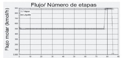 En la Fig. 5 se muestra el perfil de flujos molares de líquido y vapor en la columna destiladora de la técnica de pervaporación. Se aprecia un aumento considerable de líquido en el plato 78, debido a que es el plato de alimentación a la columna; además se evidencia que al trabajar con un condensador total, por el tope de la columna no emerge vapor, solo líquido.