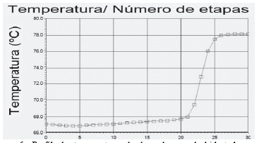 Figura 6: Perfil de temperatura de la columna deshidratadora en la destilación azeotrópica con benceno.