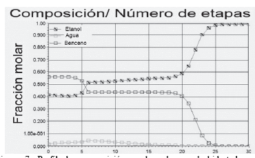 Figura 7: Perfil de composición en la columna deshidratadora en la destilación azeotrópica con benceno.