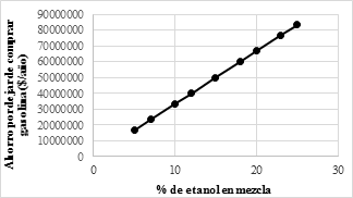 En la Fig. 8 aparecen representados los parámetros: ahorro por dejar de comprar gasolina ($/año) vs proporción de etanol en la mezcla. Se puede apreciar cómo por cada porcentaje de incremento de la cantidad de etanol en la mezcla se pueden ahorrar 3 334 800 $/año por el concepto de no comprar gasolina.