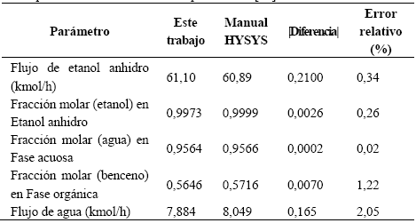 La comparación con los resultados brindados en el manual de HYSYS [12] se presenta en la Tabla 9 para varios parámetros de interés de la técnica de destilación azeotrópica con benceno. A partir de esta comparación se concluye que el esquema de simulación desarrollado está verificado al tener errores relativos menores que 5%.