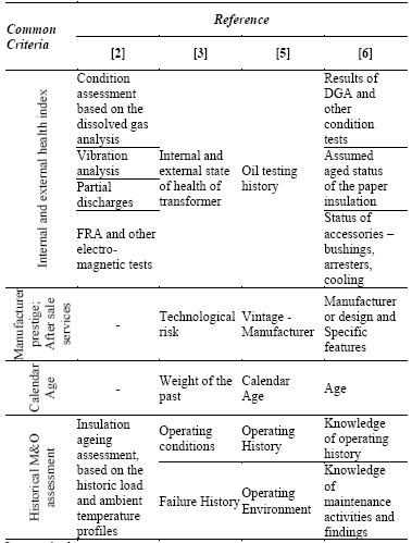 Although criteria for FPF calculation vary between references, some are similar or correlated. We can see that Table 1 identifies four common criteria (or four sets of aspects to be considered). These are: 1) The internal and external health index: this results from oil analysis and other diagnostic techniques that are useful to assess unit condition; 2) Manufacturer prestige: after-sales service, transformer technology, suitability for repair if a failure occurs, etc. are useful criteria to take into consideration; 3) Calendar age: this is an indirect indicator of the state of the unit and the risk of failure; and 4) Historical analysis of maintenance and findings: this must be performed by using the available data regarding the operation history of the unit, moreover this criteria could include the failure history.