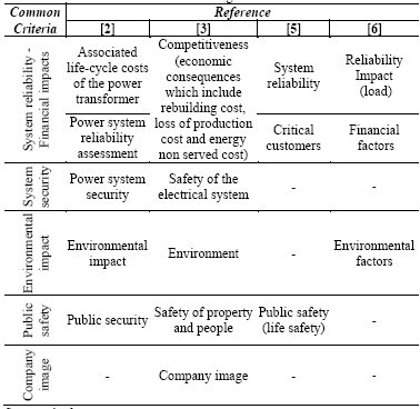 CF relies on the fact that every transformer will reach a final failure point, and the consequences of such failure may be estimated. Post-failure consequences are different for each transformer, and they usually depend on the unit location in the power system as well as other characteristics. Table 4 organizes the main criteria that are considered in references [2,3,5,6] for CF calculation.